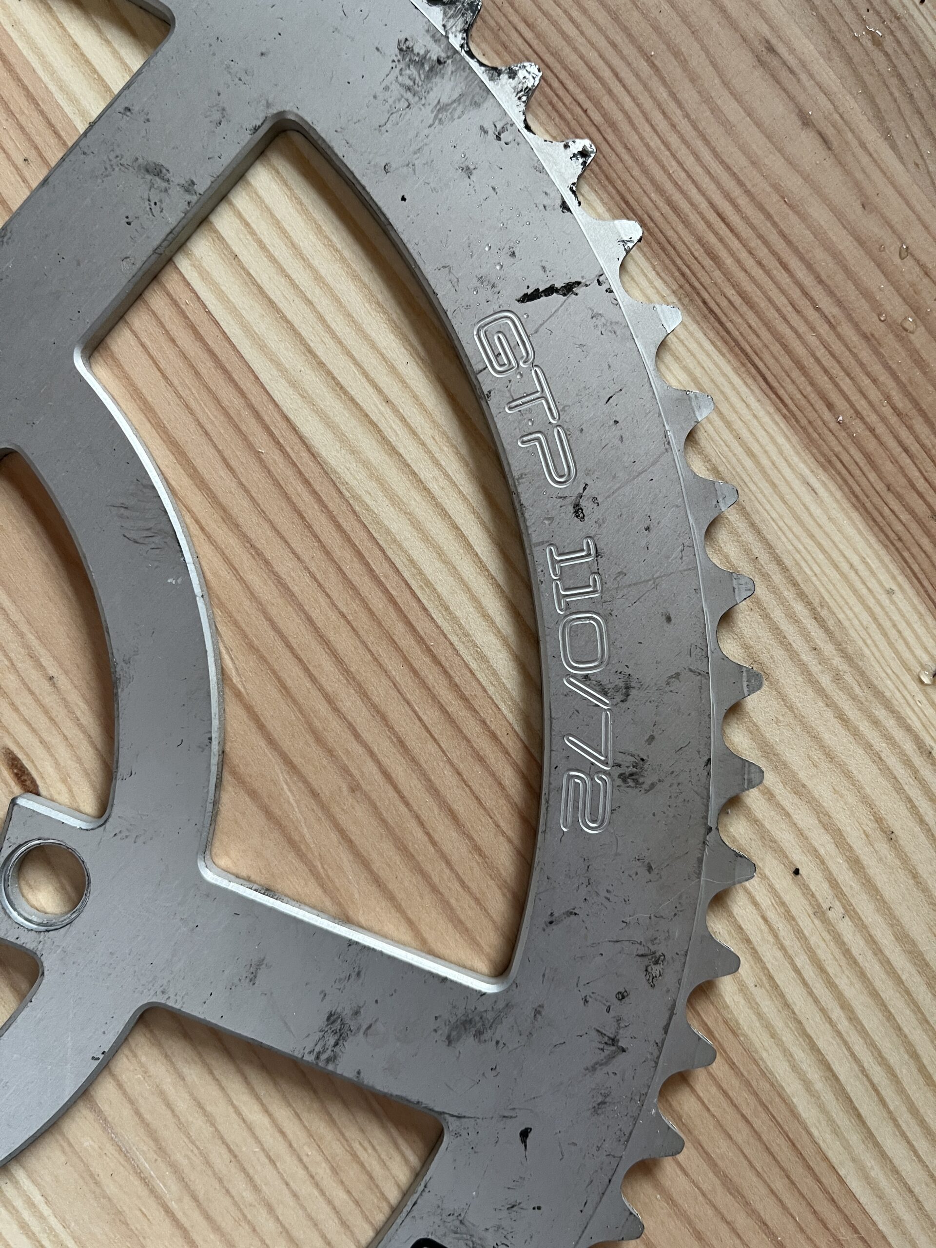 Plateaux 110BCD très peu utilisés. Ils semblent avoir encore une longue durée de vie devant eux. Ils faisaient partie de l'acquisition de l'entreprise Velomobile SH. Idéal pour ceux qui veulent aller plus vite. Le plateau 72 dents n'a pas de garde-chaîne.