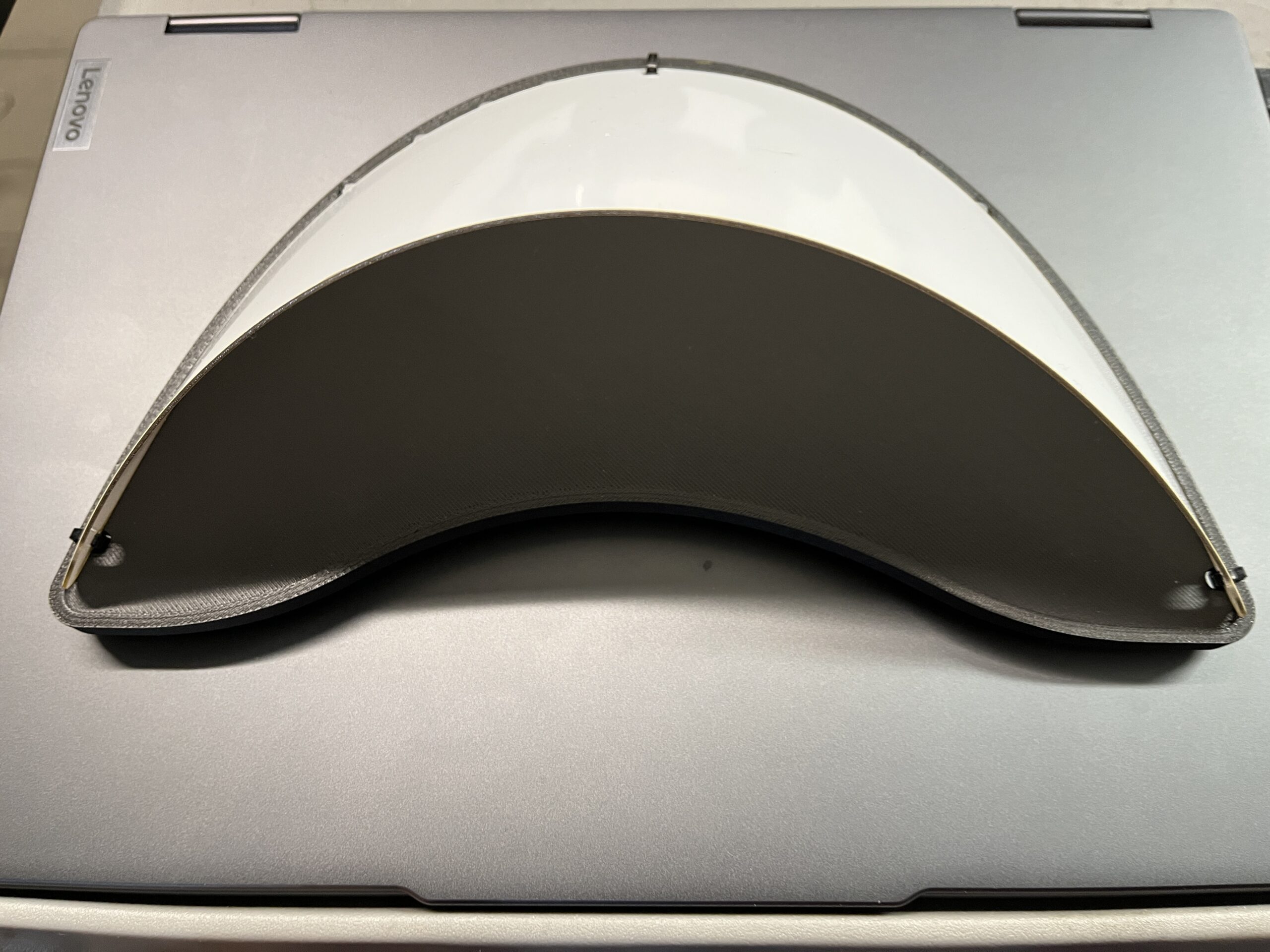 La mini visière est la solution idéale pour tous ceux qui recherchent un design élégant et compact. Avec une largeur de 236 mm et une profondeur de 144 mm, elle est particulièrement pratique et légere. La visière en Macrolon, d'une épaisseur de 1 mm, est fixée à l'aide d'un serre-câble en trois points sur la base et de trois aimants sur le corps du vélomobile. Simple et rapide. Les aimants supplémentaires fournis peuvent être fixés par le dessous.