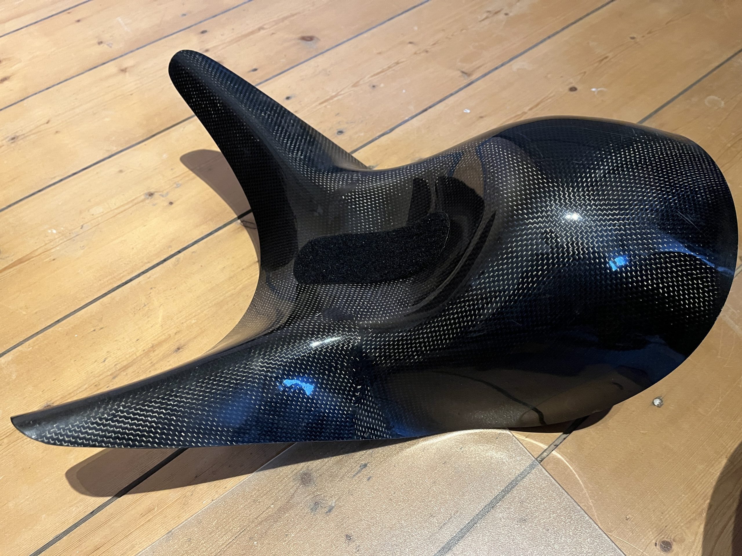 Een andere vreemde vondst in mijn verzameling willekeurige onderdelen van Velomobile SH is deze carbon hoofdsteunadapter. Dit model is de grootste hoofdsteunadapter. Als u wat meer steun achter uw hoofd nodig heeft, kan deze adapter uitkomst bieden. Normaal gesproken zijn deze vrij duur, maar ik heb er geen gebruik voor, dus u kunt ze nu voor een spotprijsje krijgen.